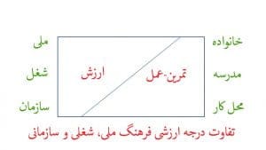 ت) هیچ ارزشی بخودی خود قابل بررسی، شناخت و کاربری نداشته و امکان استفاده از آن در هیچ زمینه ای نیست. برای مثال، ارزش خانواده در فرهنگ ایرانیان بخودی خود بی مفهوم است. ولی اگر ارزش خانواده، با معیارهای مشخص، بین ایرانیان و ژاپنیان را بخواهیم مقایسه و مورد بررسی قرار دهیم آنوقت مفهوم پذیر خواهد بود. تحولات و تغییرات ارزش خانواده در بین دو نسل ایرانی، سالهای 1346 و 1396، قابل بررسی و شناسائی است. البته معیارهای ارزشی این مقایسه باید مشخص شده باشد. برای مثال، این معیارها میزان طلاق، میزان دعواهای خانوادگی که در دادگستری مطرح شده و یا میزان ازدواجهای غیر فامیلی میتوان نامبرد.