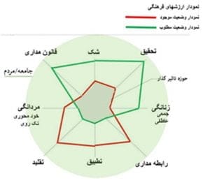 با توجه به نمودار(7) که با هشت ارزش فرهنگی و اجتماعی ترسیم شده است، به ارزیابی ارزشهای اجتماعی در مقطع کوتاه مدت بین 10 تا 20 سال که در جامعه مورد تمرین واقع شده است را در نظر میگریم. این ارزشها در سه بخش عمده تقسیم بندی شده که بقرار زیر است؛