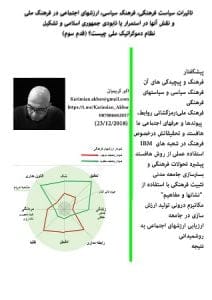 ما میتوانیم در جهت “بهسازی” یا “تخریب فرهنگ ملی” تاثیراتی بگذاریم، اما اینکه تاثیری را که میگذاریم، موجب تغییر فرهنگی و یا فرهنگی ملی را “اصلاح” نماییم، توهمی بیش نیست. چرا که برای تاثیر بر روی ارزشها یا خلق ارزشهای جدید در فرهنگ (ملی)، دو پارامتر مهم لازم است؛ یکی استمرار تمرین ارزشهای جدید یا تغییرات داده شده و دومی طول ادامه این تمرینها در زمان که بسیار طولانی است که شاید به صدها سال برسد خواهد بود. پس اگر بحث “کار فرهنگی” به معنی زمینه سازی آزادی و دموکراسی در ایران باشد، ما نمیتوانیم منتظر صدها سال باشیم تا با تغییر و اصلاح فرهنگی ملی، نظام سیاسی ضد انسانی و ضد ملی را به زباله دان تاریخ بی اندازیم. زیرا با سرعت و سیر تخریبی کشور و پیوندهای ملی و انسانی که توسط حاکمان و الیتهای وابسته به آنها به پیش میرود، در ظرف یکی دو نسل آینده، از کشور و فرهنگ “خرد گرا” و ارزشهای “آن” چیزی باقی نخواهد ماند.