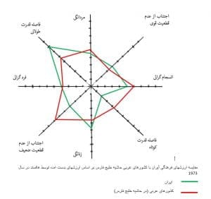 بر اساس ارزشهای فرهنگی هافستد در سال 1973 بین کشور ایران و کشورهای عربی حاشیه خلیج فارس، نمودار (4) را برای روشن شدن چگونه استفاده کردن از این داده ها ترسیم کرده ام. با توجه به این نمودار تفاوتها و اشتراکهای ارزشی بین این کشورها قابل مشاهده است. آنچه باید به آن توجه بیشتری کرد این است که؛
