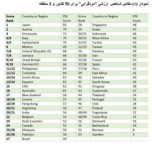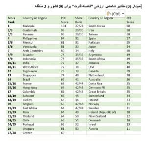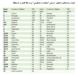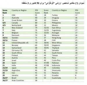 جدول ردبندی هافستد، بر اساس تفاوت ارزشی جوامع در رابطه با فاصله “کوتاه” و “طولانی” از قدرت.