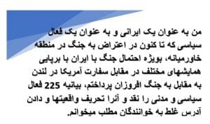 اما چرا به نقد این بیانیه که حداقل ارزش جمع شدن 225 هموطن با نگرشهای مختلف سیاسی، از استمرار طلبان تا چپهای ضد امپریالیزم، را داشت ،پرداخته ام. دلیل اش درخواست خودشان و محتوای غیر واقعی نوشته شان بود. آنان خواستند که “… مردم ایران و فعالان سیاسی و مدنی با احساس مسئولیت خطیر ملی «مذاکره بی قید وشرط» را به هر شکلی که میتوانند به حکومتگران دو کشور اعلام و ترغیب کنند”. من به عنوان یک ایرانی و به عنوان یک فعال سیاسی که تا کنون در اعتراض به جنگ در منطقه خاورمیانه، بویژه احتمال جنگ با ایران با برپایی همایشهای مختلف در مقابل سفارت امریکا در لندن به مقابل به جنگ افروزان پرداختم، بیانیه 225 فعال سیاسی و مدنی را نقد و آنرا تحریف واقعیتها و دادن آدرس غلط به خوانندگان مطلب میدانم و از اینرو آنرا نقد میکنم.