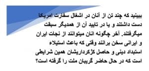 واقعیت این است که این بیانیه یک بخشش، تصویه حساب سیاسی است با آنانی که براندازند. اما با این ترفندها و انکار واقعیتها، آنان نمیتوانند حرف اکثریت براندازان را تحریف کنند؛ جمهوری اسلامی یک نظام ادم کش، تروریست و بی کفایت است و باید به زباله دان تاریخ برای همیشه سپرده شود. شما در بین این براندازانی که اینچنین هدفی را دنبال میکنند، نام 100 نفر از آنانرا که خواهان حمله نظامی امریکا به ایران باشند بیاورید و به مردم معرفی کنید. بگذارید خود مردم تکلیفشان را با انها روشن کنند.