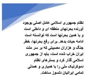 اگر ما، ملت بزرگ ایران، خواهان رفع تحریمها، خطر جنگ و هزاران شوربختی دیگر که بر سر مان فروریخته است را داشته باشیم، راهی جز گذار از نظام ضد انسانی و ضد ملی جمهوری اسلامی به نظام دموکراتیک ملی نداریم.